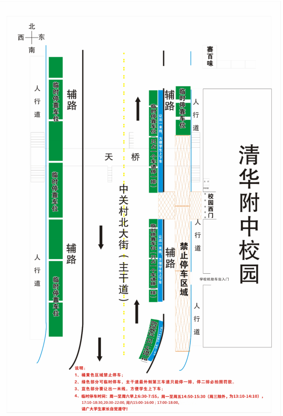 车辆要安全停靠在允许临时停车的指定位置。放学时,家长接送车辆可按照《清华附中校园周边临时停车示意图》安全停靠在“绿色”区域,但不要占用“橙色”禁停区域,不要堵塞过街天桥出入口及桥下自行车停放区出入口。