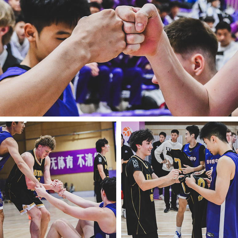 赛场上,清华附中男篮队员与犹他预科学院队员展开激烈而友好的对抗:快速传切、精准三分、果断篮板争夺,每一个精彩瞬间都引发现场欢呼。比赛中,双方队员深度互动 —— 赛前相互击掌致意,赛中默契配合救球,赛后拥抱合影,真正践行“友谊第一,比赛第二”的宗旨。附中队员将对母校的热爱融入每一次攻防,美国队员则展现出同样的拼搏精神,赛场内外的尊重与理解,成为最鲜活的“国际视野”教育课。