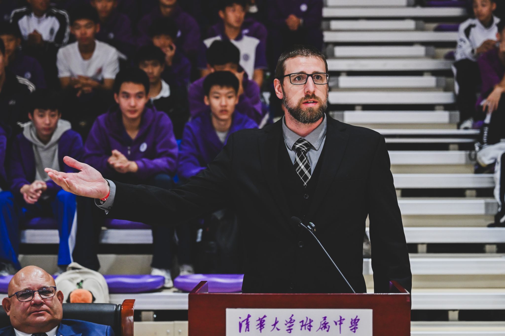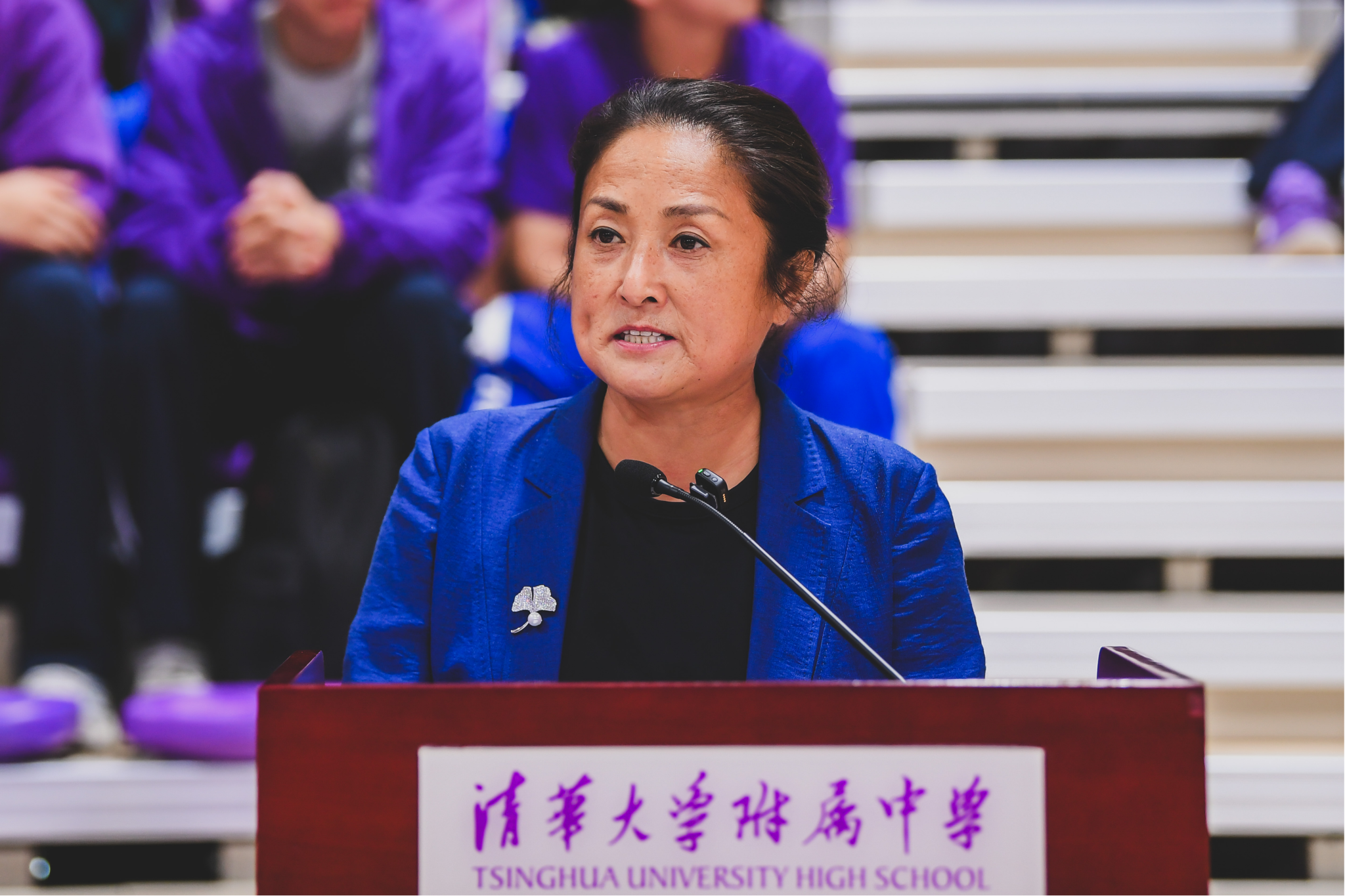 方妍校长在致辞中提及,清华附中始终以体育为育人核心支柱,从奥运冠军杨倩的荣耀绽放,到斩获14次全国冠军的男篮、9次夺冠的女篮的辉煌成就,无一不印证着“体教融合”的强大力量。她期待中美青年能成为相知相亲的友好使者,以民间外交传递“推动构建人类命运共同体”的友好理念,在尊重包容中以篮球为纽带缔结深厚友谊。