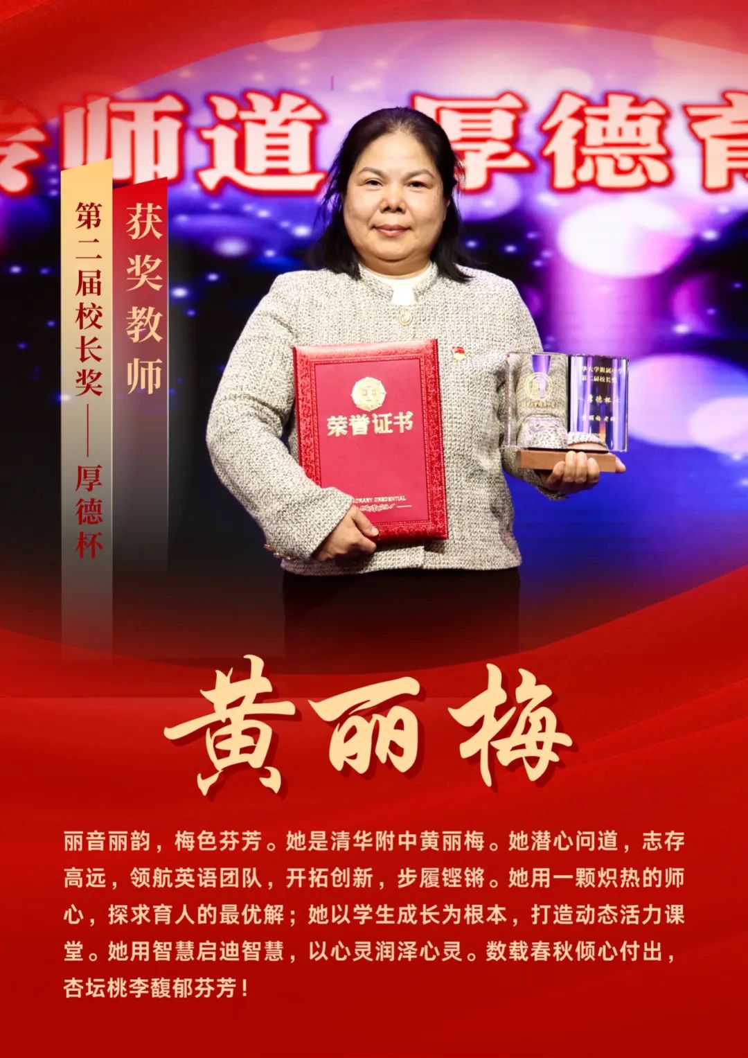 黄丽梅,英语教研组党支部书记,英语教研组组长,北京市学科骨干教师,被聘为北京市高中英语教师资格国考面试考官,北京外国语大学国培计划培训专家,北京市普通高中学业水平合格性考试命题专家,北师大教育学部硕士研究生毕业论文评阅专家和北京师范大学专业学位兼职导师。