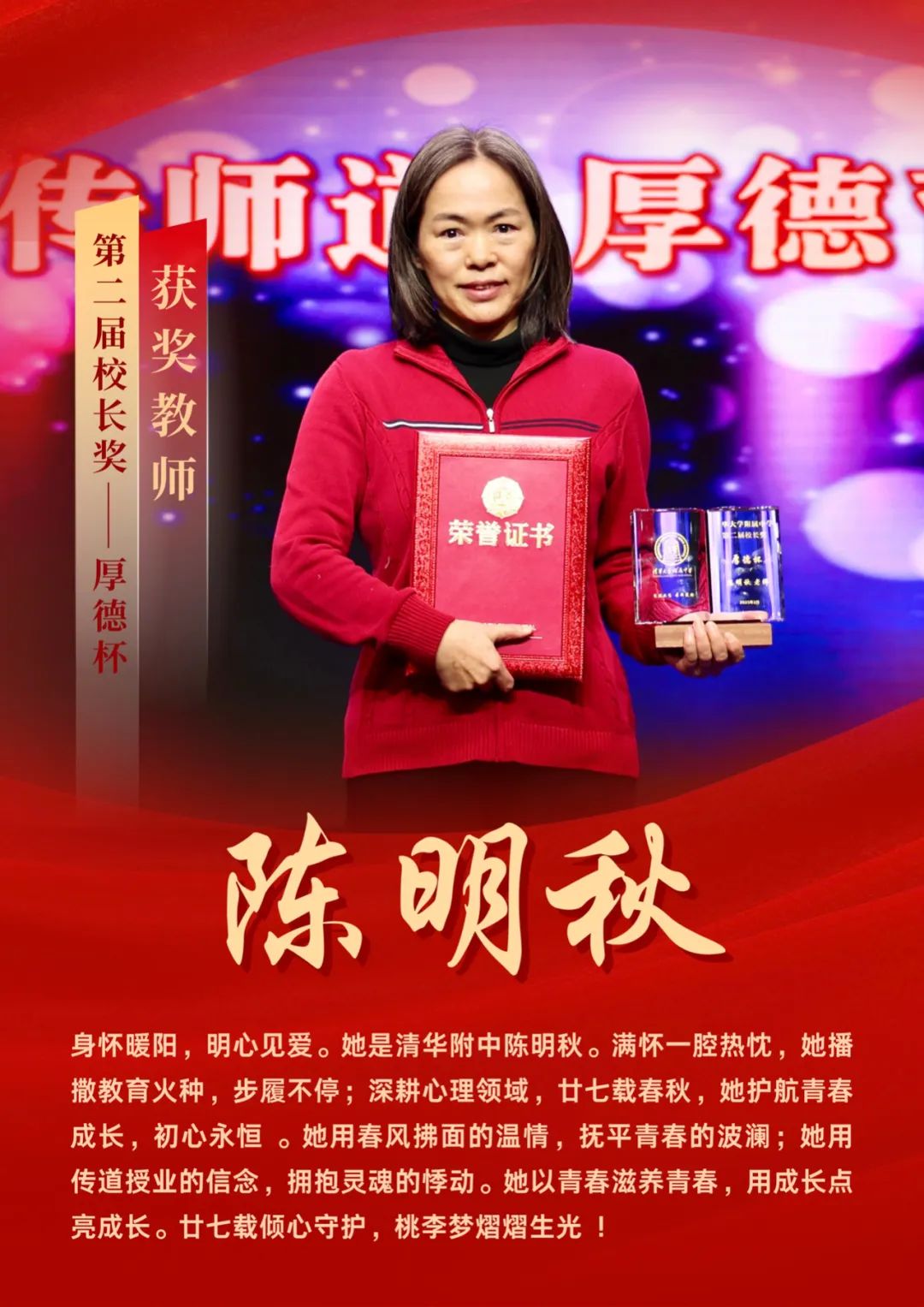 陈老师用爱心、耐心和责任心,书写自己的职业生涯,被评为海淀区优秀心理教师、海淀区优秀“四有”教师、清华大学先进工作者、启迪奖爱岗敬业奖。“教育是生命与生命的对话”,陈老师用专业与热爱搭建起通往学生心灵的桥梁,让心理健康教育成为校园里温暖的阳光!