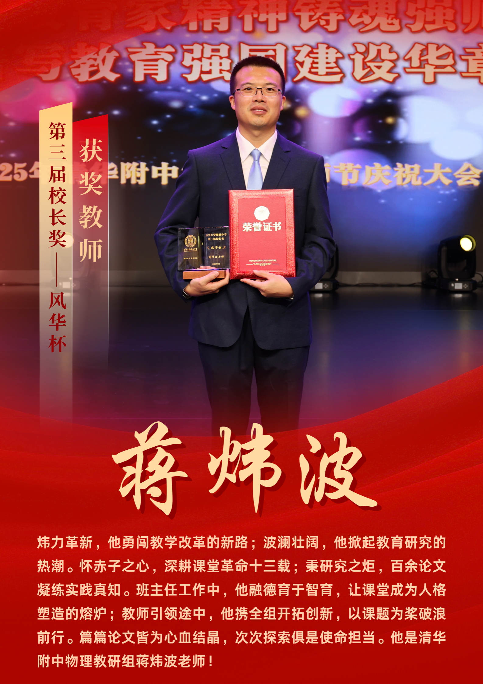 蒋炜波老师,清华附中课堂革命的践行者,他坚持“以教促研、以研助教”,将教科研融入到教育教学的各个方面。在班主任工作中,他深入研究并实施学科德育,智育和德育的融合让课堂变成了育人的主阵地;在物理教学工作中,他始终以学生为主体,开发了问题解决型、任务驱动型、思维发展型等多种教学模式,切实以培养学生高阶思维为核心,驱动物理学科的教与学;在教师队伍建设中,他通过教研课题带领全组教师共赴课堂革命,探索教育教学的新策略、新模式,有力地促进了教师们的专业发展。他以实际行动将研究氛围扎根在了附中校园。