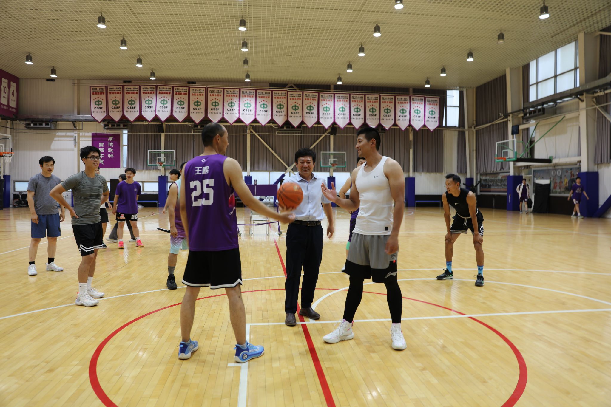 傍晚,清华附中篮球馆热闹非凡,校友与教职工们满怀期待,陆续到场。清华附中副校长、校友会副会长白雪峰亲临现场,代表学校热烈欢迎校友返校,并对教职工的辛勤付出表示感谢。他强调,此次篮球赛不仅是技艺的切磋,更是校友与教职工情感交流的桥梁,希望大家赛出风格、赛出水平,继续传承“无体育不清华”的精神。