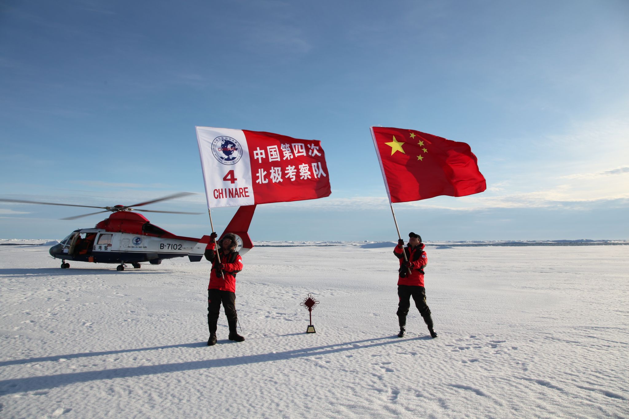 吴军(右)和首席科学家高举国旗和考察队旗在北极点海冰上